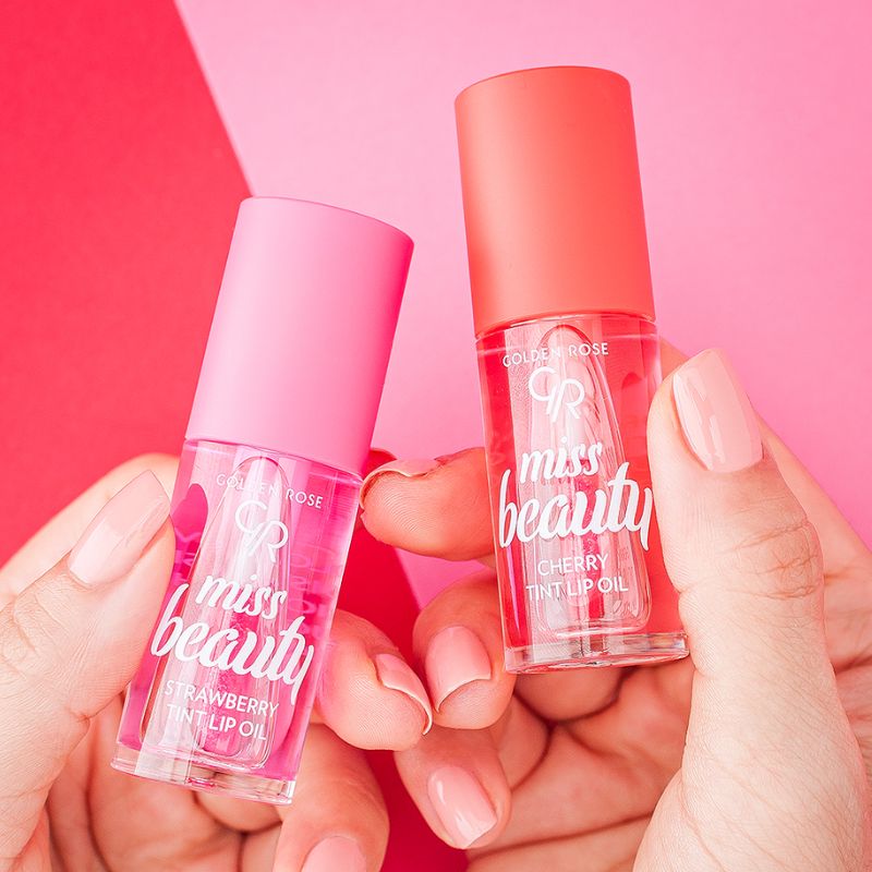 Miss Beauty Tint Lip Oil – Strawberry: een verzorgende lipolie met een lichte strawberry geur die de lippen hydrateert en een mooie glans geeft.